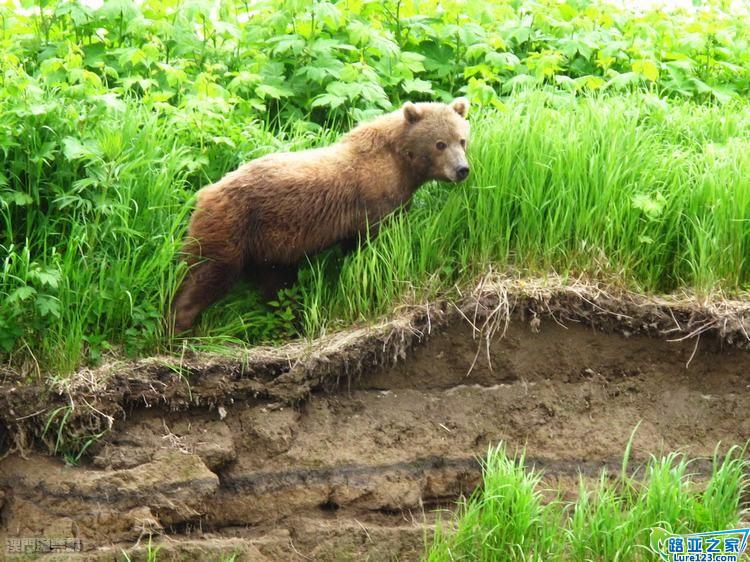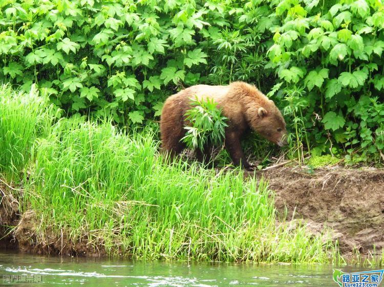 橡皮艇正準備駛到河段的上游,我們幾位也順道欣賞大自然的美景,茂密的樹林作前景,背景則是一座座積著茫茫白雪的高山,一幅大自然鬼斧神工的佳作,正當大伙兒欣賞美景之際有團友發現一團棕色的物體在岸上移動,船隻走近了才發現了那正是一隻勘察加小棕熊呀!可愛!可愛!幾名釣友瞬間取出各自的相機捕捉那美妙的一刻,小棕熊發現到他成為我們的目標後迅即逃回林中。